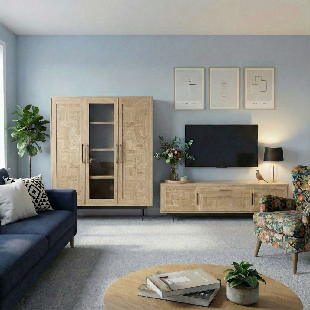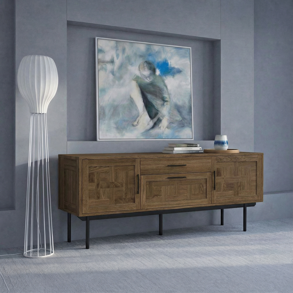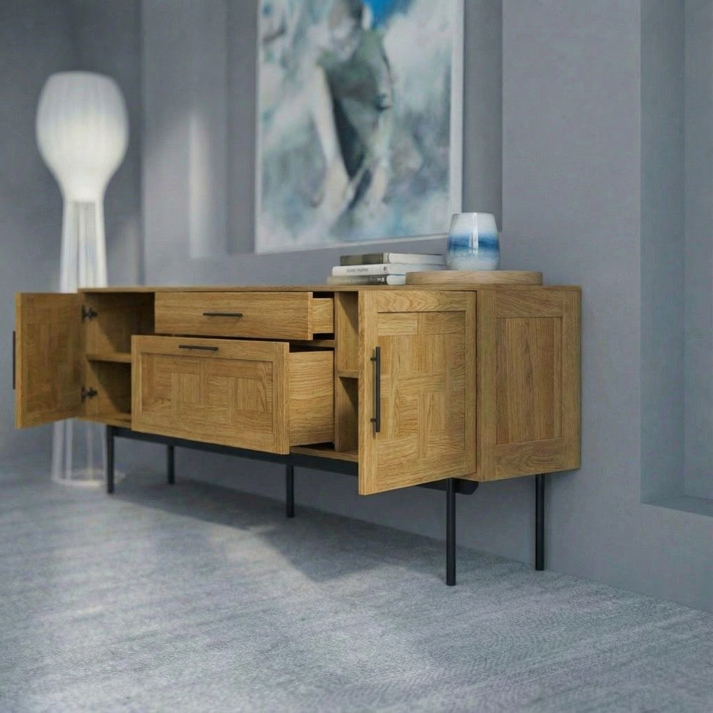 Ein massiver TV-Ständer aus Eiche (B 200 cm × T 44 cm × H 75 cm) mit einem einzigartigen geometrischen Muster an den Fronten. Ausgestattet mit zwei geschlossenen Fächern, einer Schublade und einem offenen Fach, bietet er idealen Platz für Elektronik oder Dekoration. Die Metallbeine verleihen dem Design eine moderne Note und sorgen für Stabilität. Hergestellt aus umweltfreundlichen Materialien, ist dieses Möbelstück eine stilvolle und funktionale Ergänzung für jedes Interieur.
