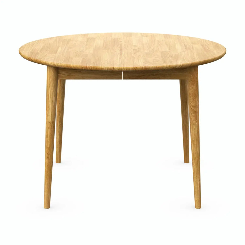 Ein wunderschön gearbeiteter runder Esstisch aus Eiche natur (B 110 cm / 150 cm / 190 cm × T 110 cm × H 75 cm) . Dank der mittigen Verlängerung (B 40 cm × T 110 cm × H 75 cm) lässt sich der Tisch flexibel an größere Gesellschaften anpassen und ist somit vielseitig und praktisch. Sein elegantes, rundes Design und die abgerundeten Kanten verleihen jedem Essbereich zeitlosen Charme. Hergestellt aus umweltfreundlichen Materialien, vereint dieser Tisch Funktionalität, Langlebigkeit und klassischen Stil und passt sowohl zu modernen als auch zu traditionellen Einrichtungen.