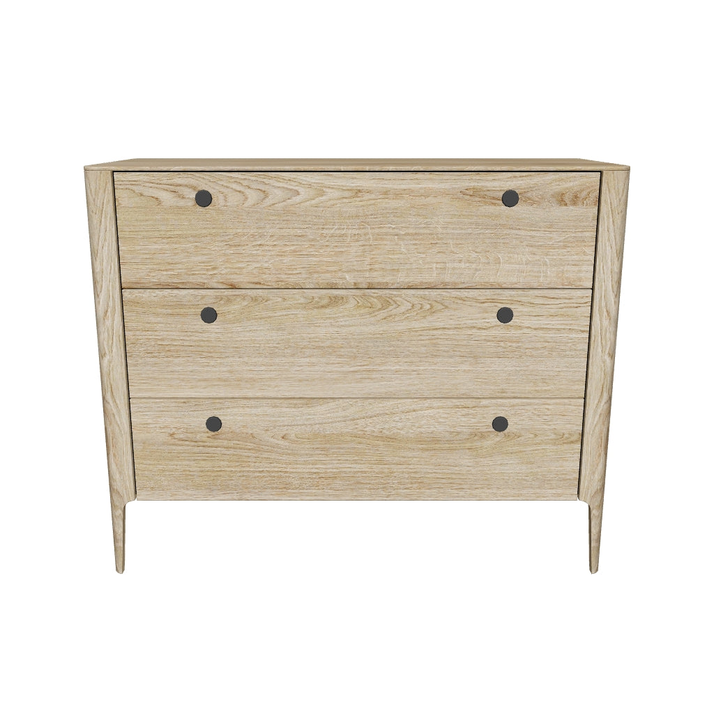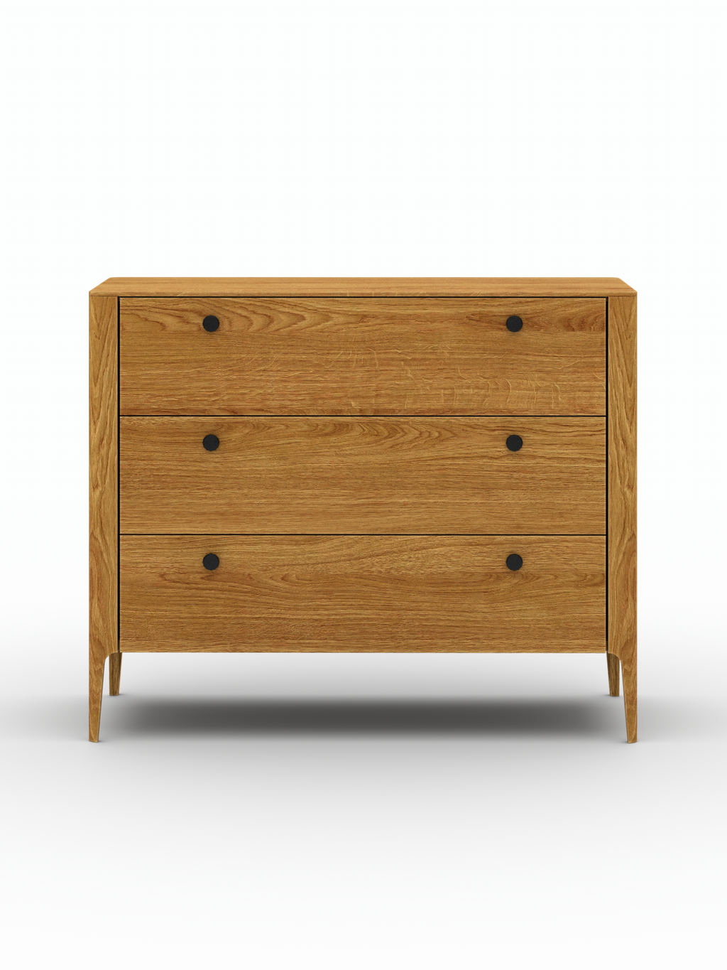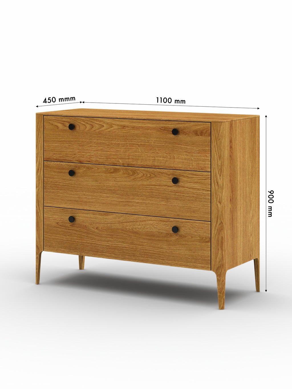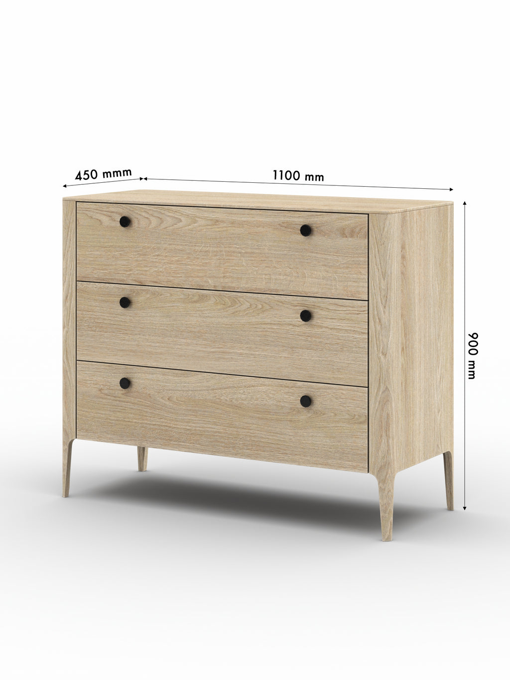Diese elegante Kommode aus Eiche natur (B 110 cm × T 45 cm × H 90 cm) bietet drei geräumige Schubladen zur praktischen Aufbewahrung von Kleidung, Bettwäsche oder Haushaltsgegenständen. Ihr minimalistisches Design, die klaren Linien und die natürliche Holzmaserung verleihen jedem Schlaf- oder Wohnzimmer zeitlosen Charme. Hergestellt aus umweltfreundlichen Materialien, ist diese Kommode sowohl langlebig als auch stilvoll und somit eine praktische und schöne Ergänzung für moderne wie klassische Einrichtungen.