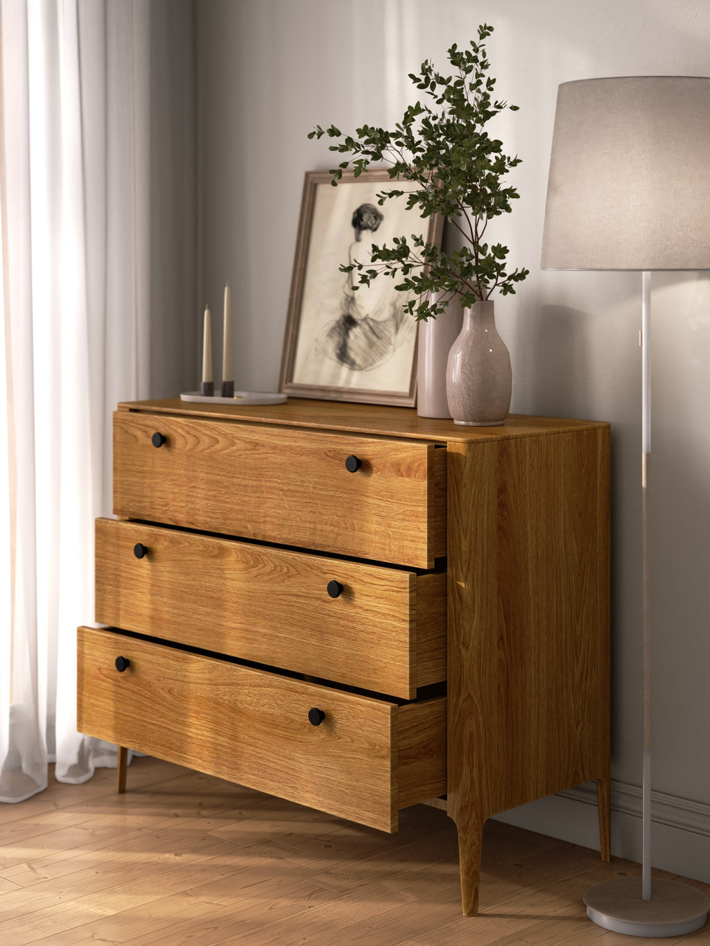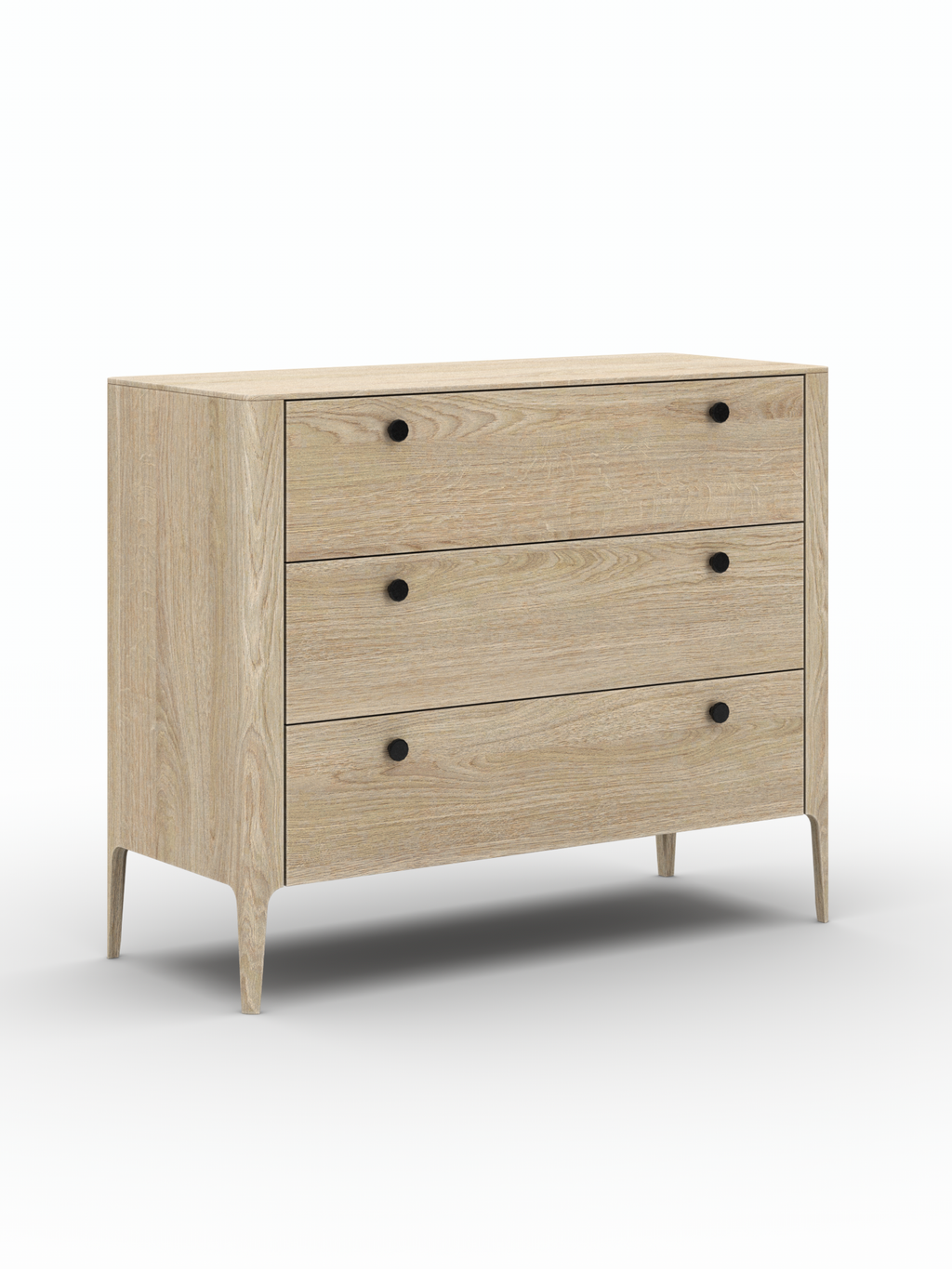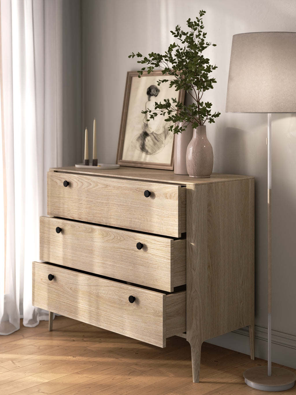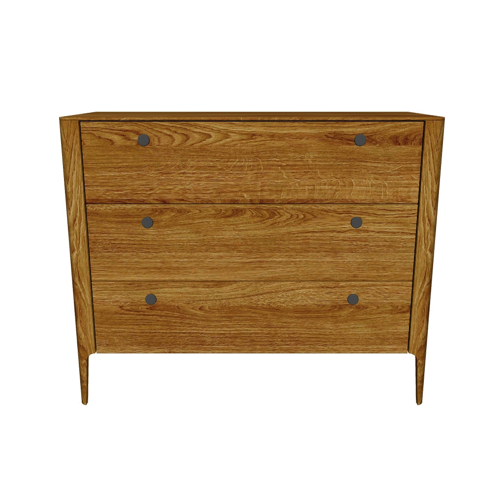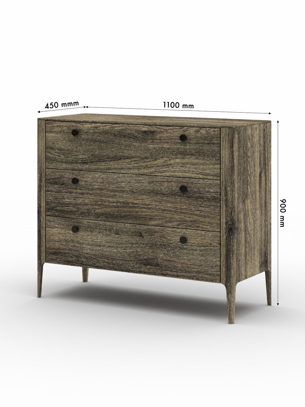 Diese elegante Kommode aus Eiche natur (B 110 cm × T 45 cm × H 90 cm) bietet drei geräumige Schubladen zur praktischen Aufbewahrung von Kleidung, Bettwäsche oder Haushaltsgegenständen. Ihr minimalistisches Design, die klaren Linien und die natürliche Holzmaserung verleihen jedem Schlaf- oder Wohnzimmer zeitlosen Charme. Hergestellt aus umweltfreundlichen Materialien, ist diese Kommode sowohl langlebig als auch stilvoll und somit eine praktische und schöne Ergänzung für moderne wie klassische Einrichtungen.