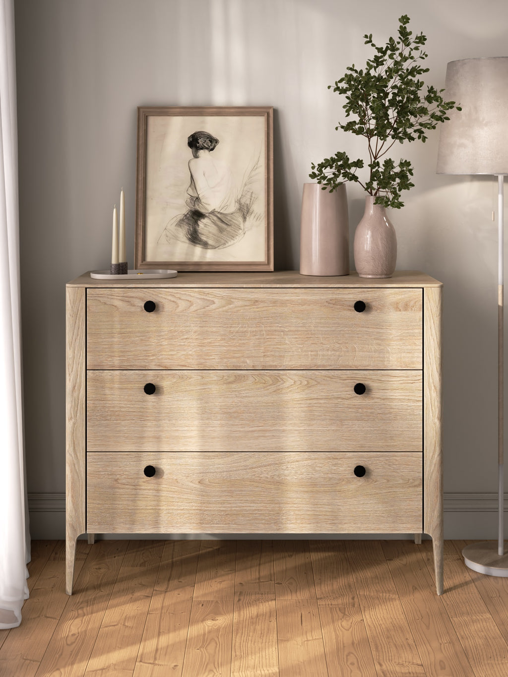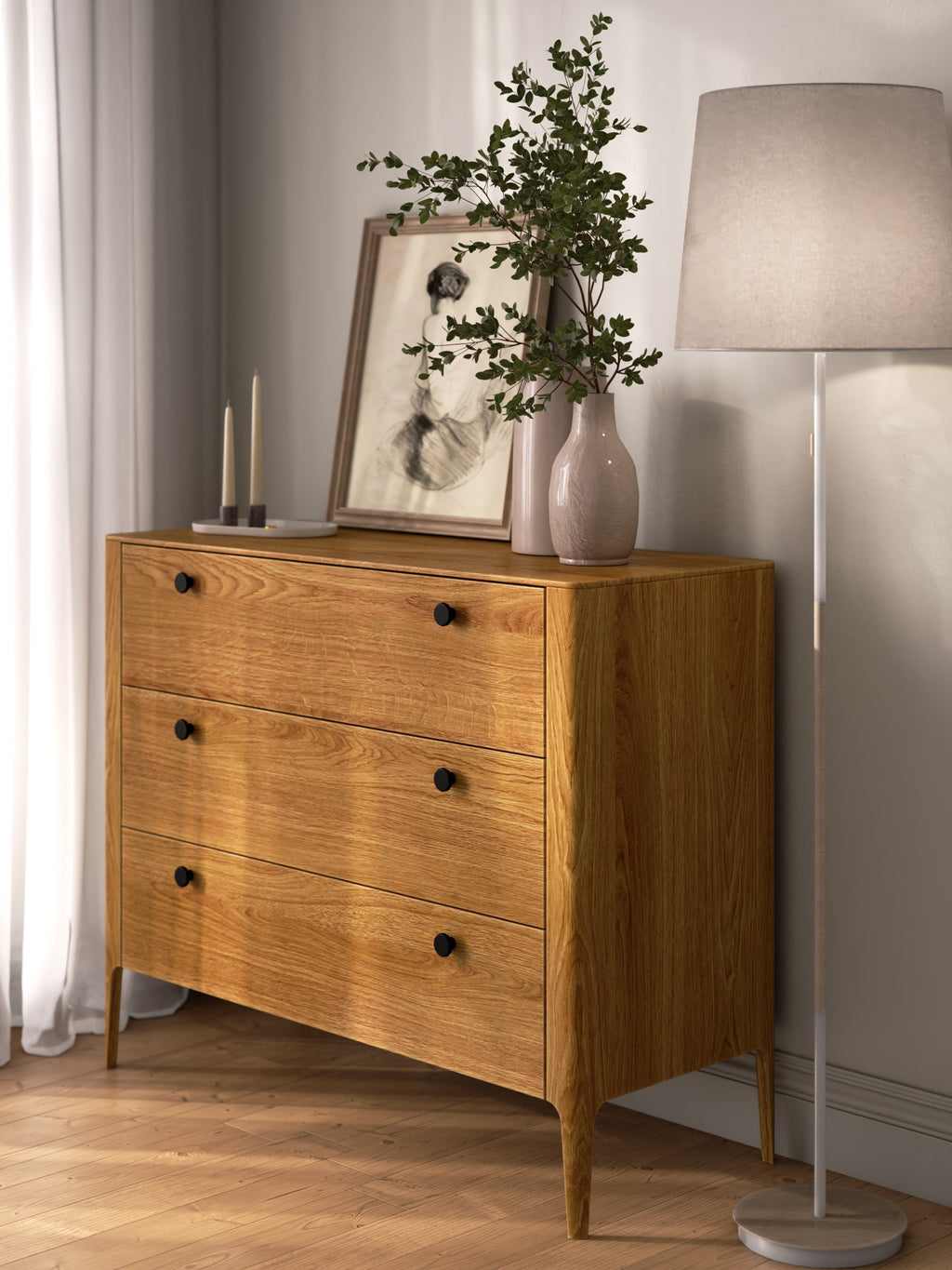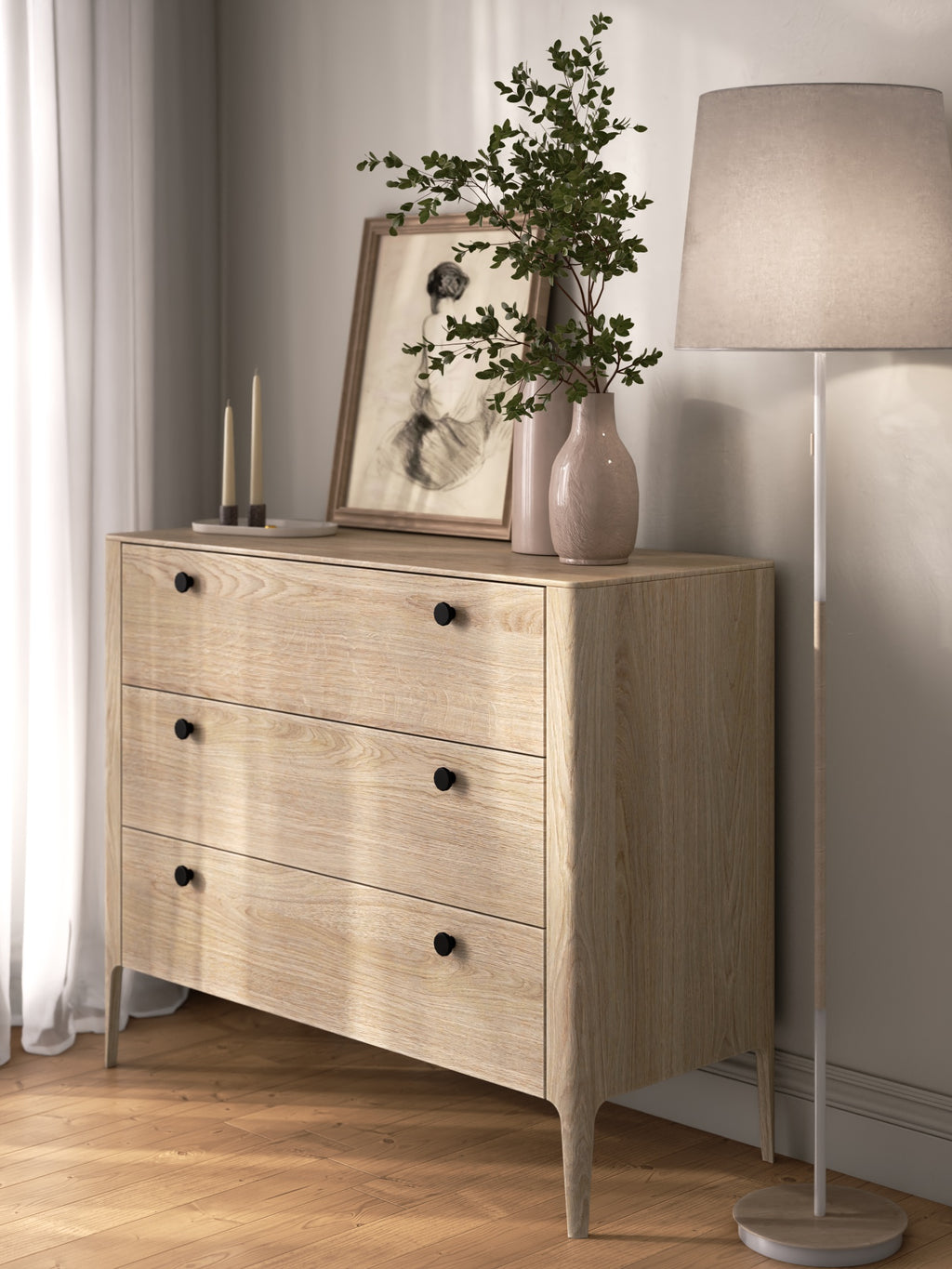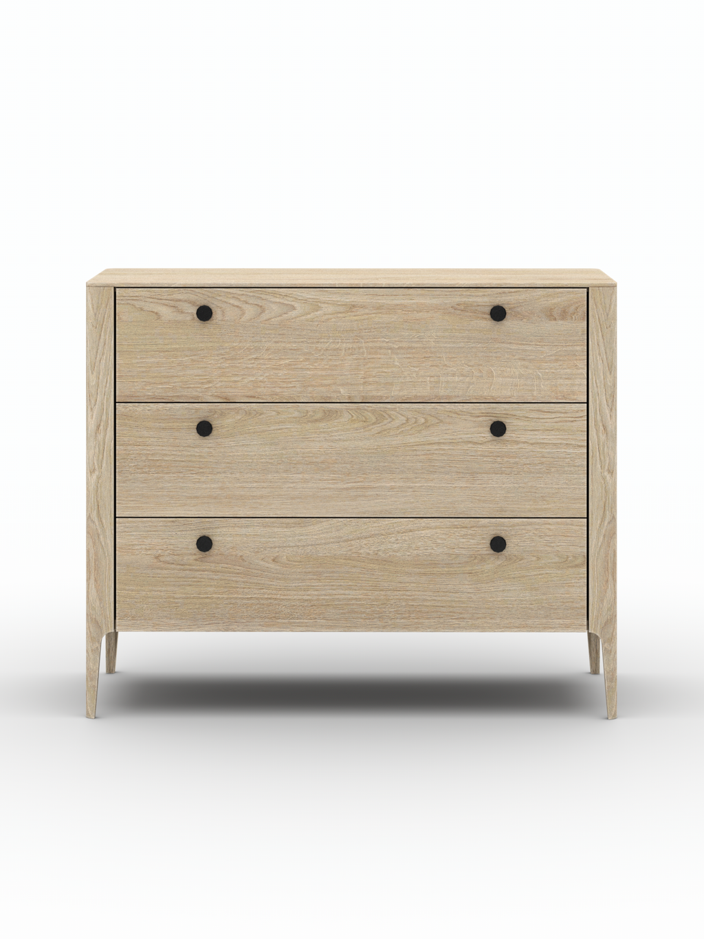 Diese elegante Kommode aus Eiche natur (B 110 cm × T 45 cm × H 90 cm) bietet drei geräumige Schubladen zur praktischen Aufbewahrung von Kleidung, Bettwäsche oder Haushaltsgegenständen. Ihr minimalistisches Design, die klaren Linien und die natürliche Holzmaserung verleihen jedem Schlaf- oder Wohnzimmer zeitlosen Charme. Hergestellt aus umweltfreundlichen Materialien, ist diese Kommode sowohl langlebig als auch stilvoll und somit eine praktische und schöne Ergänzung für moderne wie klassische Einrichtungen.