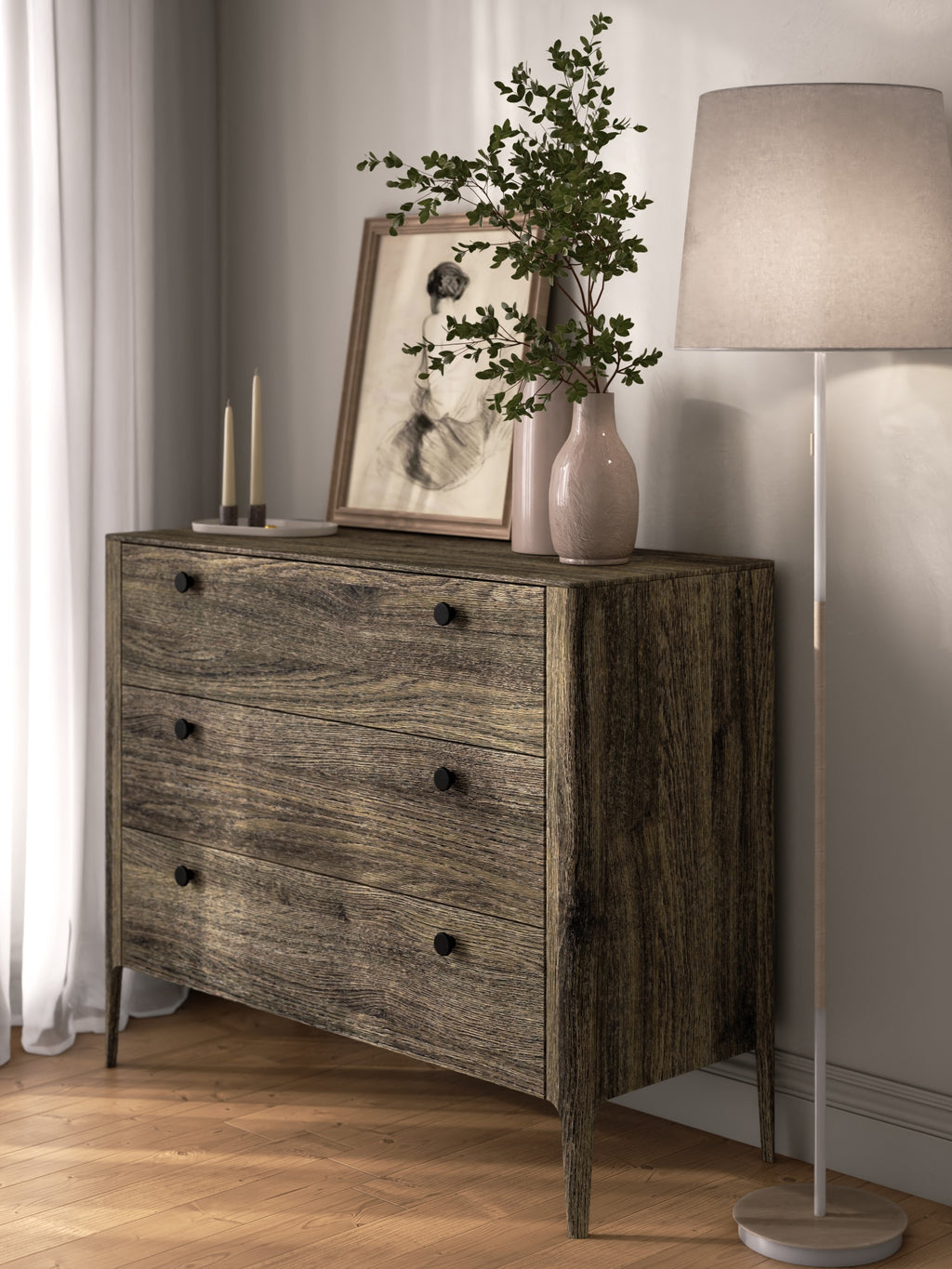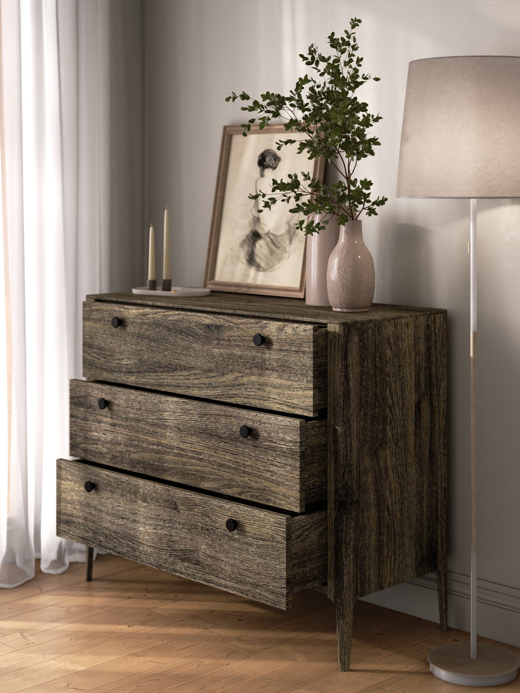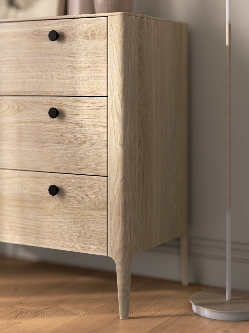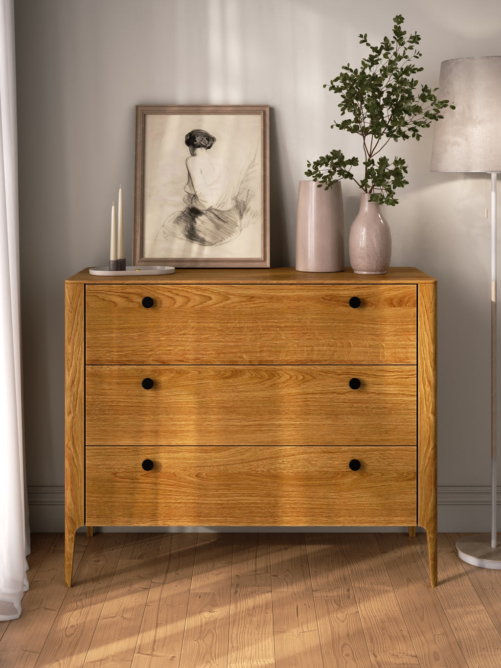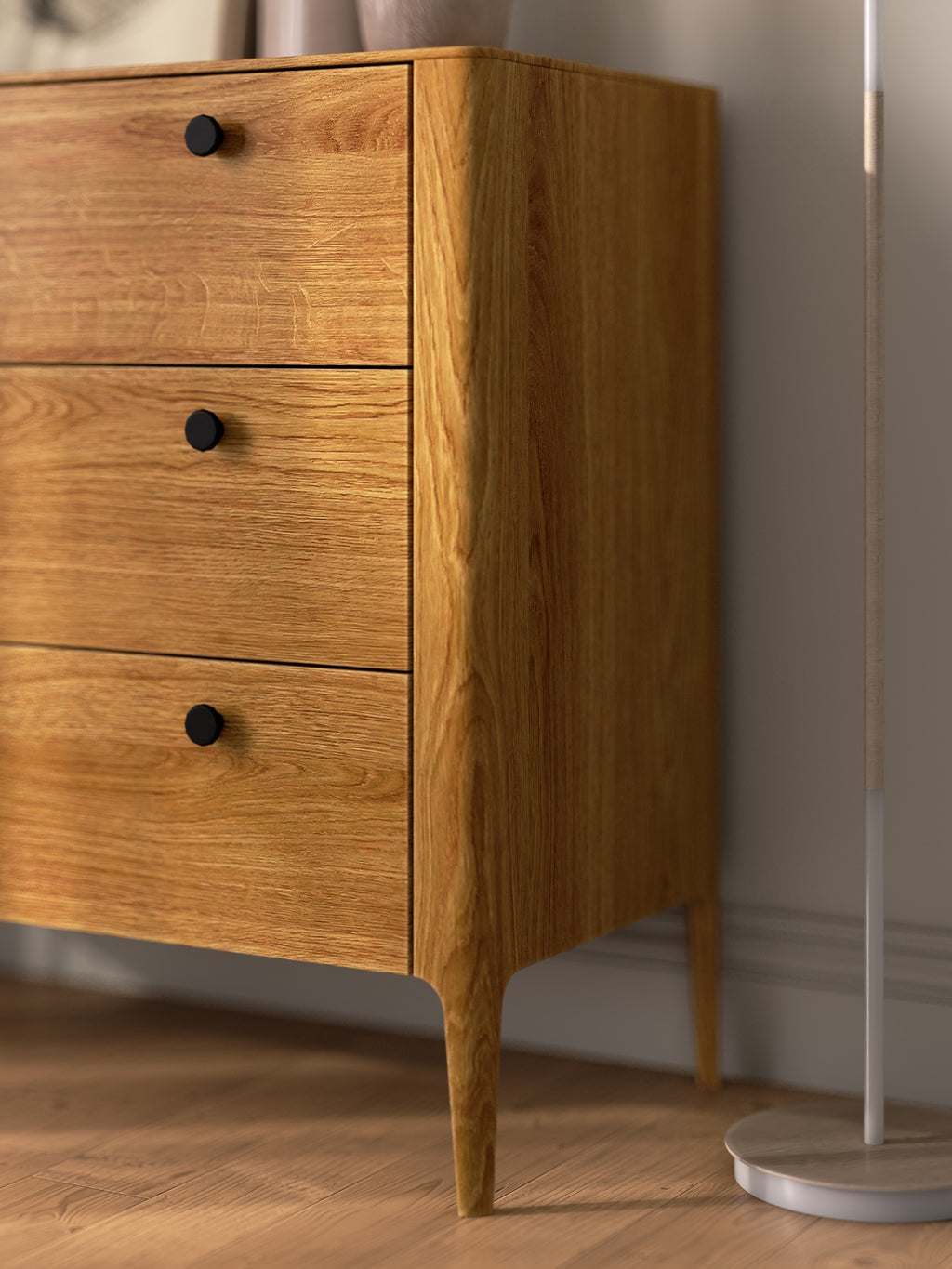 Diese elegante Kommode aus Eiche natur (B 110 cm × T 45 cm × H 90 cm) bietet drei geräumige Schubladen zur praktischen Aufbewahrung von Kleidung, Bettwäsche oder Haushaltsgegenständen. Ihr minimalistisches Design, die klaren Linien und die natürliche Holzmaserung verleihen jedem Schlaf- oder Wohnzimmer zeitlosen Charme. Hergestellt aus umweltfreundlichen Materialien, ist diese Kommode sowohl langlebig als auch stilvoll und somit eine praktische und schöne Ergänzung für moderne wie klassische Einrichtungen.