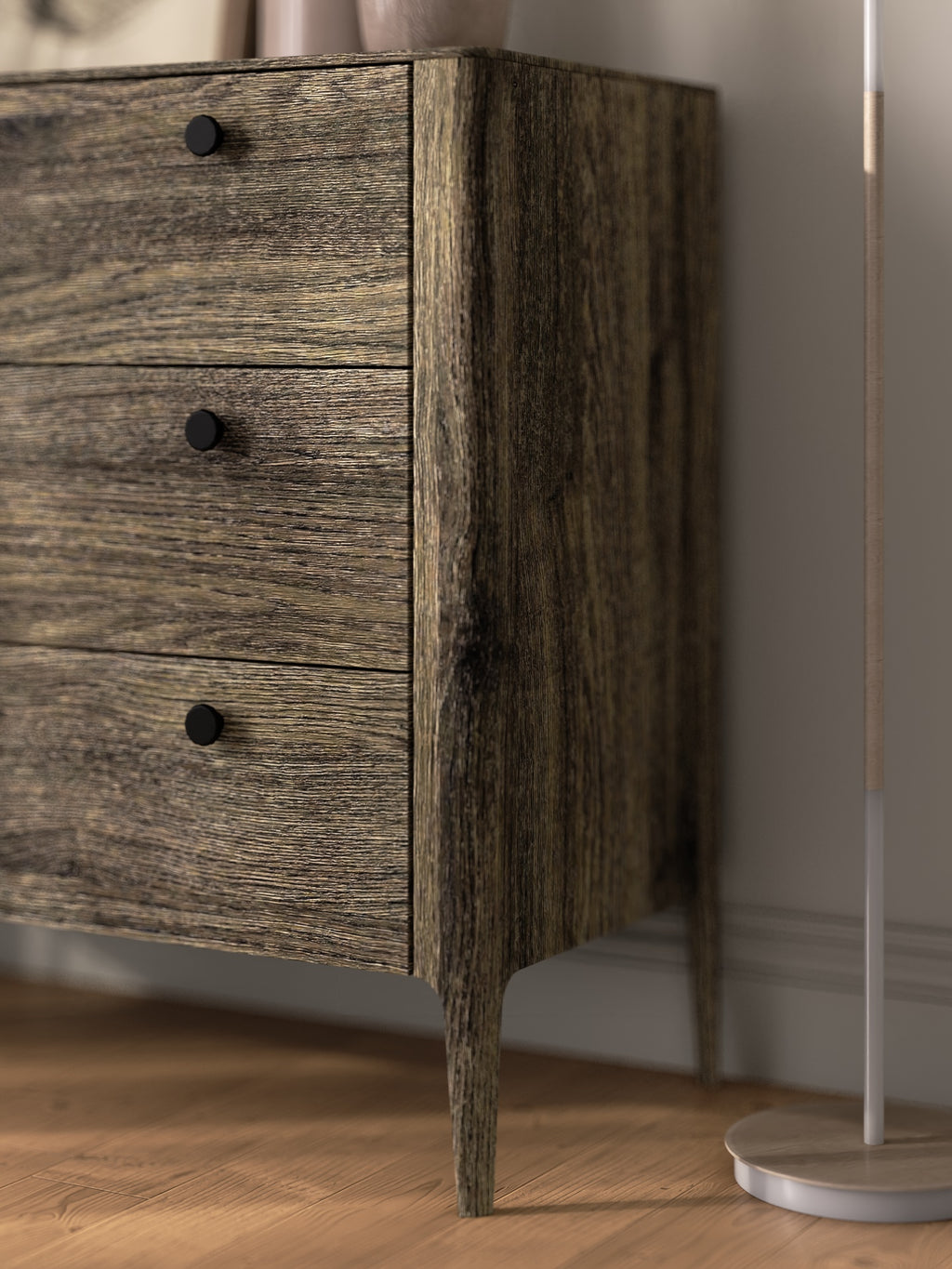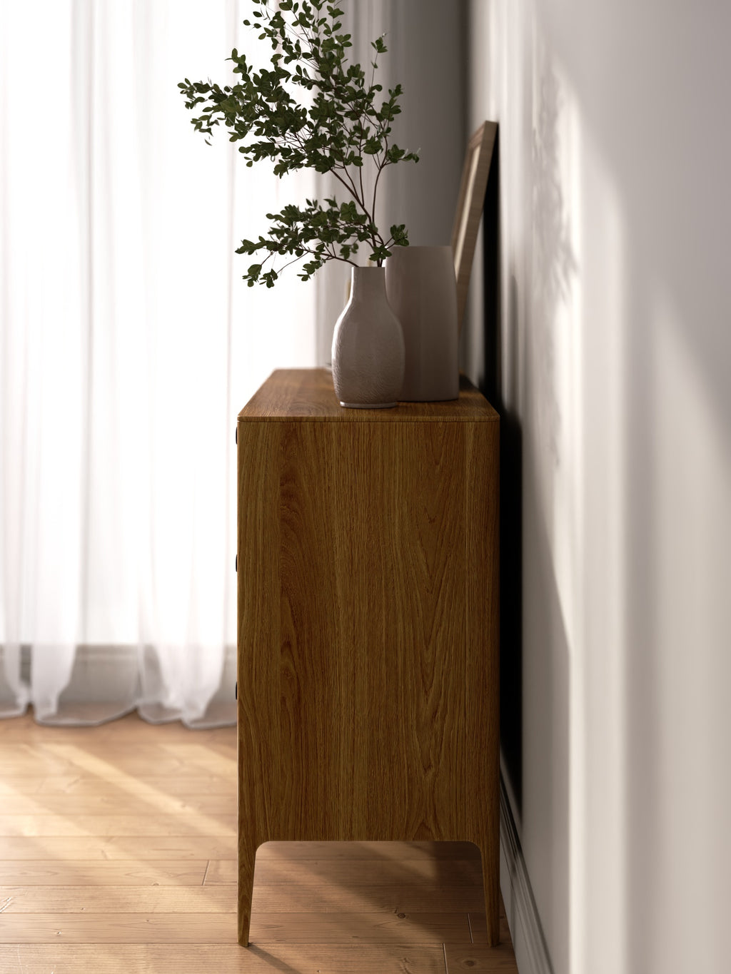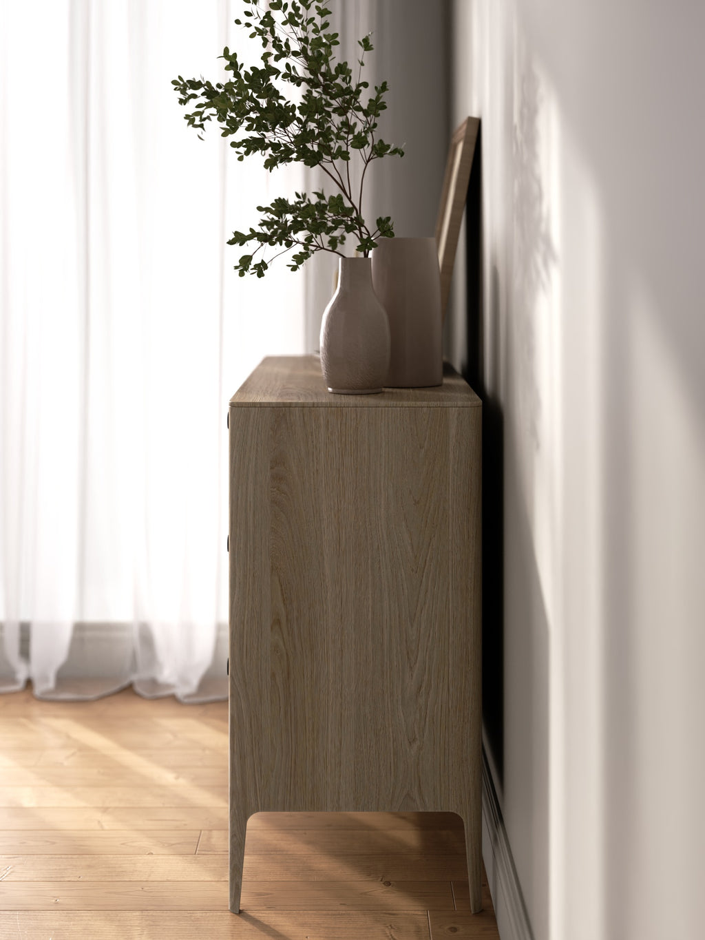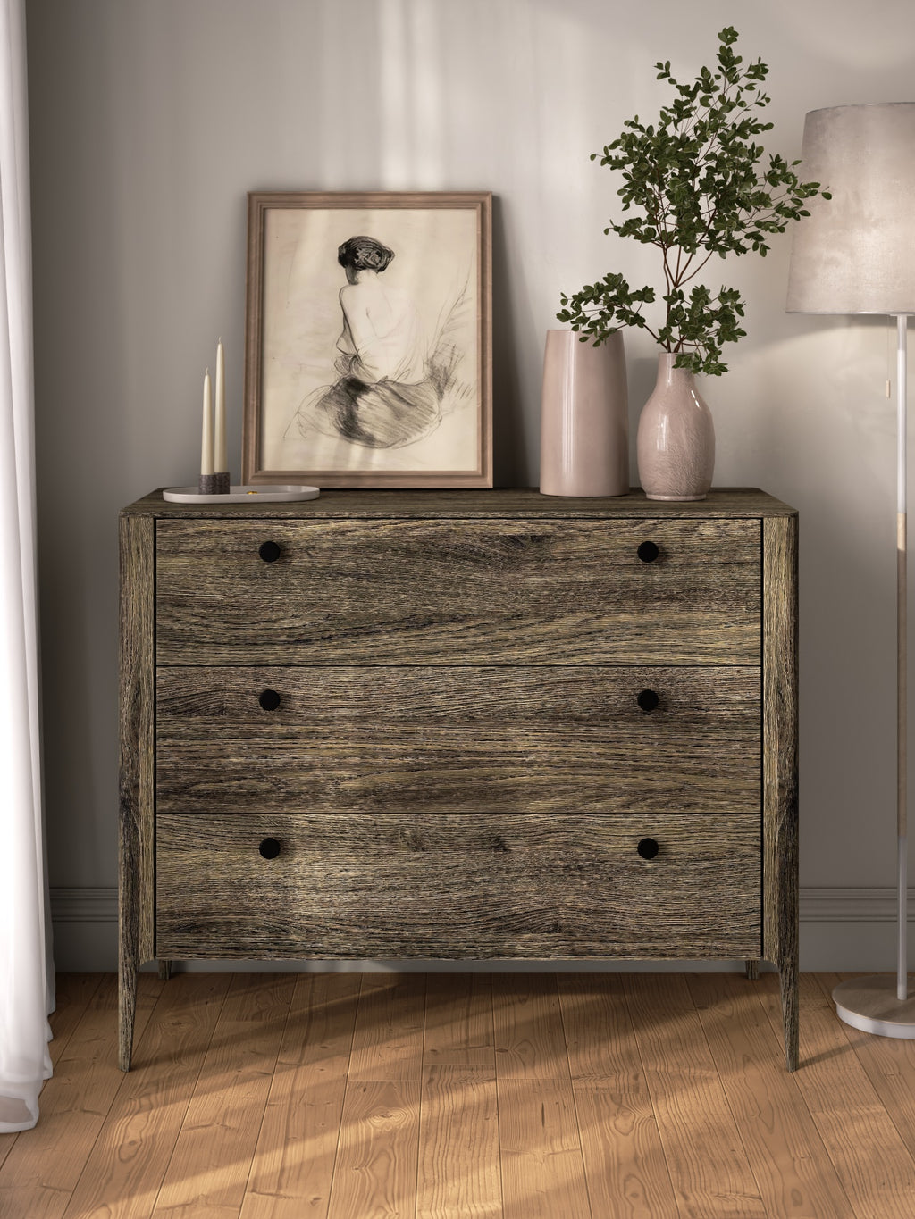 Diese elegante Kommode aus Eiche natur (B 110 cm × T 45 cm × H 90 cm) bietet drei geräumige Schubladen zur praktischen Aufbewahrung von Kleidung, Bettwäsche oder Haushaltsgegenständen. Ihr minimalistisches Design, die klaren Linien und die natürliche Holzmaserung verleihen jedem Schlaf- oder Wohnzimmer zeitlosen Charme. Hergestellt aus umweltfreundlichen Materialien, ist diese Kommode sowohl langlebig als auch stilvoll und somit eine praktische und schöne Ergänzung für moderne wie klassische Einrichtungen.