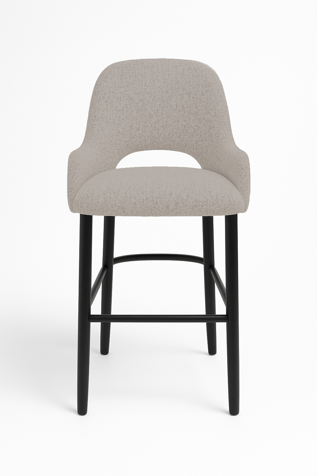 This modern bar chair with upholstered seat and curved backrest combines contemporary design with exceptional comfort, making it perfect for kitchen islands and stylish bar areas. The light textured fabric and cushioned seat provide elegance and support, while the sturdy black legs with footrest ensure durability and stability. Ideal as a designer bar chair or counter stool, it adds sophistication and functionality to any modern interior.